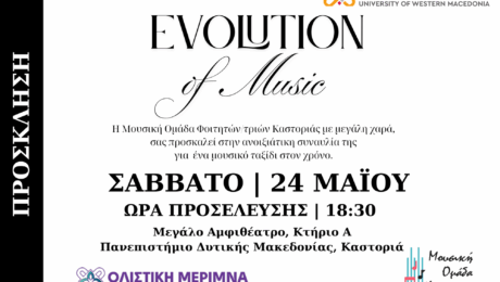 Συναυλία «Evolusion of Music Concert» της Μουσικής Ομάδας Καστοριάς της Ολιστικής Μέριμνας του ΠΔΜ, θα πραγματοποιηθεί το Σάββατο 24 Μαϊου 2025 και ώρα 19:00. Τι ενώνει τον Chopin με τον Βαμβακάρη, τη Βέμπο με τους Nirvana και τον Μαραβέγια με τον Eminem; Ελάτε μαζί μας σε ένα μουσικό ταξίδι στο χρόνο! Η συναυλία θα πραγματοποιηθεί